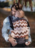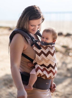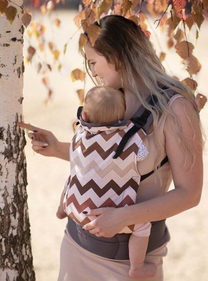Universelle ergonomische Babytrage Basic, die für die Kinder vom 6-8 Lebensmonat bis zu 2-2,5 Jahren bestimmt wird, die die Kleidungen in der Größe von 74 zu 92/98 cm tragen. Die Höhe des Panels kann dadurch reduziert werden, dass den Kragen der Babytrage auf der Höhe des Halses des Kinds umgekrempelt wird. Stark gefüllter Hüftgürtel wird bereiten, dass das Gewicht des Kinds weniger empfindlich wird und die Babytrage sich bei den Personen mit den Problemen der Wirbelsäule eignen wird.